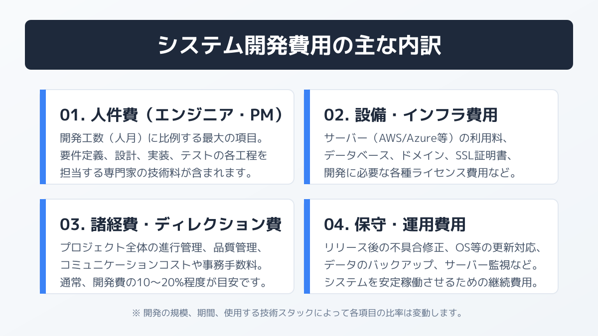 目標とする資金調達額を正確に設定するためには、システム開発にかかる費用の内訳と相場を正しく理解することが不可欠です。費用の大部分はエンジニアの労働力に依存しており、一般的にシステム開発費用の約8割を人件費が占めます(出典: システム開発にかかる費用はどのくらい?費用計算の方法も解説! - 発注ナビ)。