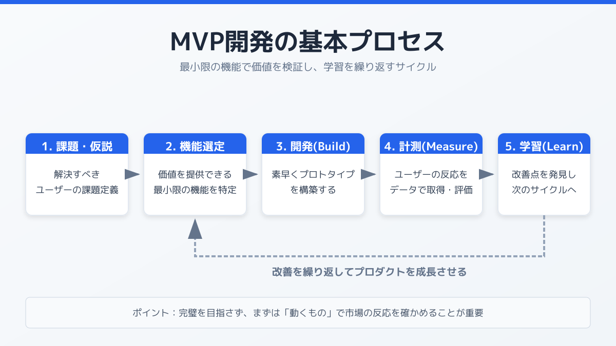 そこで有効なのが、顧客に価値を提供できる最小限の機能を持ったプロダクトを構築する「MVP(Minimum Viable Product)開発」です。初期段階では大きなリスクを取らず、最小限の投資で市場の反応を確かめるアプローチが不可欠です。具体的な検証ステップや最小限の機能を決める基準については、MVPとは?新規事業を失敗させない開発の基本と7つの検証ステップも参考にしてください。