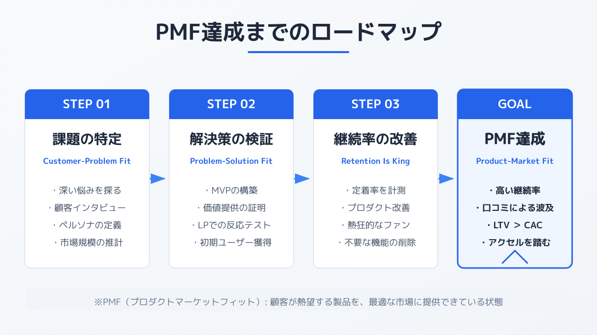 要点として、PMF達成に向けた最短ロードマップは、顧客の真の課題を発見し、最小限の機能(MVP)で検証を繰り返すアプローチが求められます。まずはターゲット層が抱える切実な課題に向き合うことが第一歩となります。