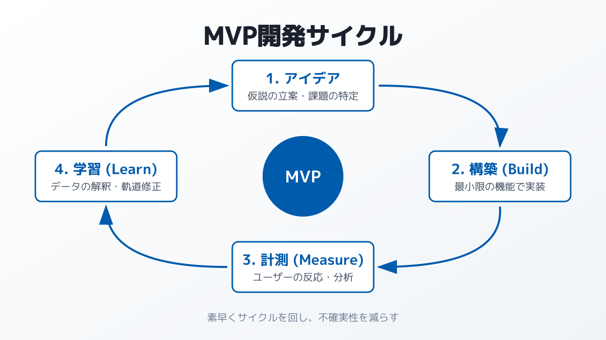 仮説を立て、MVPを市場に投入し、得られたデータをもとに改善を行うというサイクルを高速で回すことが、無駄な開発コストを抑えつつ成功確率を高める基本事項です。