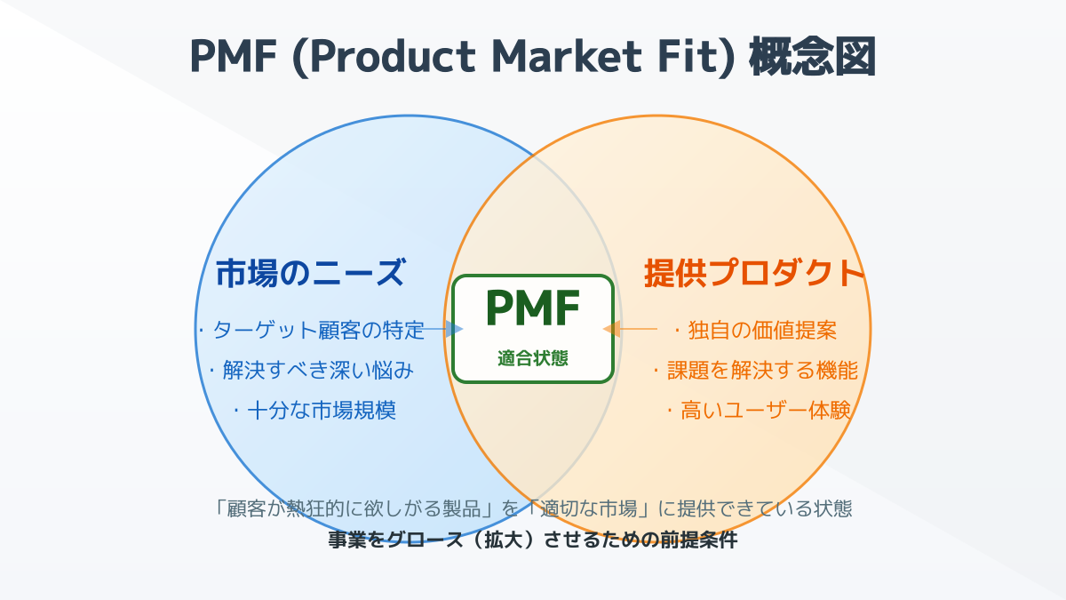 まずは、PMFの基本事項を整理します。PMFとは、提供するサービスが特定の市場で顧客の熱狂的な支持を得ている状態を指します。起業や新規事業においてPMFを達成することは、事業存続の絶対条件です。