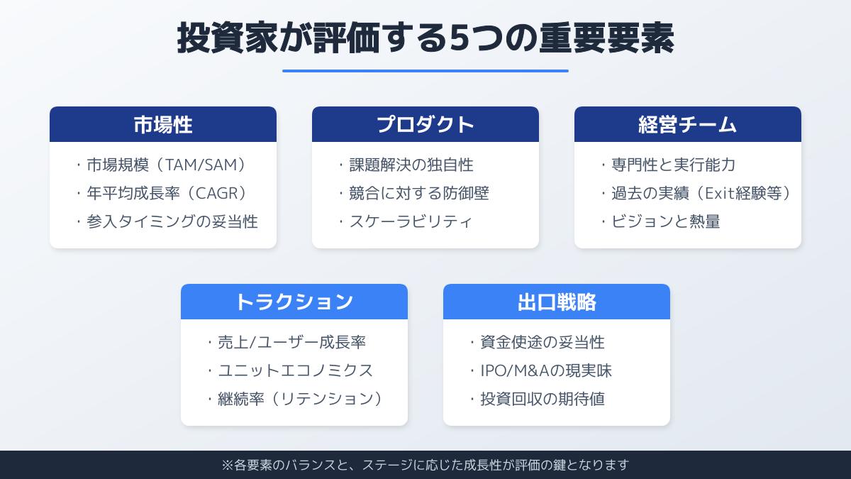 資金調達 において、投資家がどのような基準で企業を評価しているかを把握することは成功への第一歩です。特に創業初期のスタートアップでは、事業計画以上に「誰が実行するのか」が厳しく問われます。