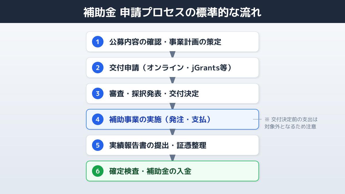新規事業 補助金を現場で運用する際には、申請から受給までのプロセスと特有の注意点を深く理解しておくことが欠かせません。補助金は「申請すればすぐに受け取れる」ものではなく、原則として事業を実施し、費用の支払いが完了した後に支給される 後払い方式 です。